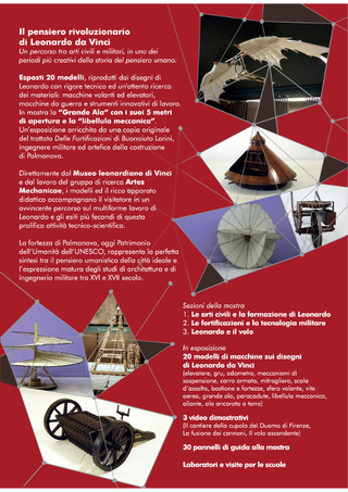 Esposti 20 modelli, riprodotti dai disegni di Leonardo con rigore tecnico ed un'attenta ricerca dei materiali: macchine volanti ed elevatori, macchine da guerra e strumenti innovativi di lavoro. In mostra la “Grande Ala” con i suoi 5 metri di apertura e la “libellula meccanica”. Un’esposizione arricchita da una copia originale del trattato Delle Fortificazioni di Buonaiuto Lorini, ingegnere militare ed artefice della costruzione di Palmanova.