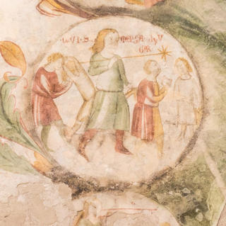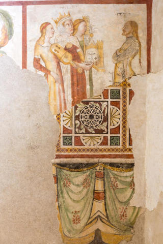 On the right, the section with a scene of a courtly subject is still partly covered by the more recent, 15th-century layer, with geometric motifs of faux marble inlays and the depiction of a curtain, painted over the previous one.