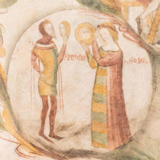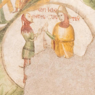 In the next medallion, a young man and a young woman are depicted standing facing each other. The man is dressed in a tight-fitting green and yellow bodice, which covers him down to the groin, and wears a headpiece with a long and narrow hood, and red stockings, and holds a mirror with his left hand. The female figure, elegantly dressed in a long, low-cut red gown with green and yellow horizontal stripes, has her hair tied with a red garland and gazes at herself in a circular mirror. The inscription traced at the shoulder height of the two young people reads "Qui cominciano a tenersi bene".