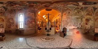 Eseguiti in due tempi (1516 la volta, 1525-26 le pareti) gli affreschi di Travesio illustrano Storie della vita di S. Pietro (nel soffitto l'ariosa scena con S. Pietro accolto in cielo) e di S. Paolo, oltre ad Episodi del Vecchio e del Nuovo Testamento, a figure di Santi, a putti ed a figure femminili allegoriche (Prudenza, Temperanza, Carità, Fede, Giustizia, Fortezza) nel sottarco.