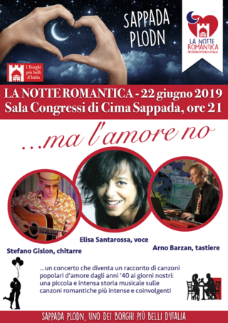 A Sappada Plodn, bellissimo borgo delle Alte Dolomiti, alle 21 nella Sala Congressi di Cima Sappada Notte Romantica vedrà l’esibizione di Elisa Santarossa (voce), Arno Barzan (tastiere) e Stefano Gislon (chitarre) in Ma l’amore no, un concerto che diventa un racconto di canzoni popolari d'amore dagli Anni 40 ai giorni nostri: una piccola e intensa storia musicale sulle canzoni romantiche più intense e coinvolgenti.