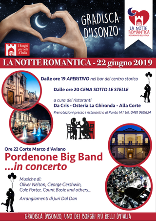 A Gradisca d’Isonzo, la Città Fortezza, dopo gli aperitivi e la cena romantica servita da alcuni ristoranti del borgo, si terrà in Corte Marco d’Aviano l’esibizione della Pordenone Big Band che, diretta da Juri Dal Dan, presenterà brani di Oliver Nelson, George Gershwin, Cole Porter, Count Basie e tanti altri: un groove calibrato su misura per le esigenze stilistiche dei vari autori e generi, regalerà al pubblico una serata ricca di suggestioni sonore dinamiche e sognanti