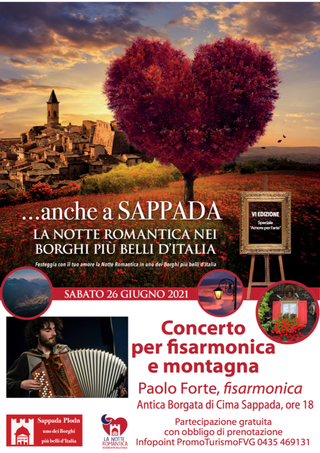 Anche le Dolomiti e il borgo di Sappada vengono toccate da Notte Romantica: alle 18 del 26 giugno il fisarmonicista Paolo Forte farà risuonare le inconfondibili note dello strumento lungo le vie dell'antica borgata di Cima Sappada.