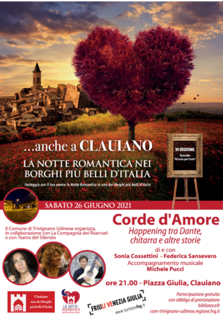 A Clauiano (Trivignano Udinese), torna il tema Dantesco: Sonia Cossettini e Federica Sansevero, accompagnate alla chitarra da Flavio Pucci, toccano immaginarie "Corde d'Amore", in un'happening tra Dante, la chitarra e altre storie. Un collaborazione con La Compagnia dei Riservati e con Teatro del Silenzio.