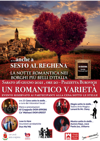Sarà una cena speciale sotto le stelle ad animare il pregevole borgo di Sesto Al Reghena, romanticamente allestito per l’occasione. Una serata all’insegna di un moderno Varietà che interseca profumi e sapori a diversi e divertenti generi artistici.