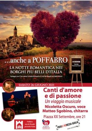 A Poffabro, nella suggestiva piazza del borgo armoniosamente incastonato nella natura della Val Colvera, Nicoletta Oscuro e Matteo Sgobino proporranno uno speciale racconto musicale: Canti d’amore e di passione.