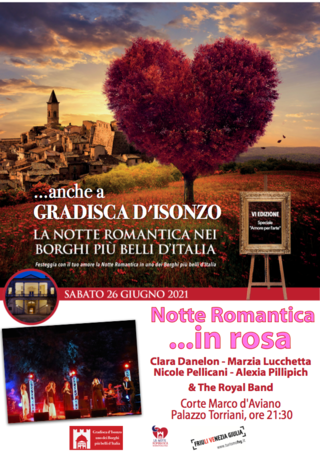 La Notte Romantica ...in rosa farà vivere una serata speciale, tutta di voci femminili, nel Borgo della Fortezza, Gradisca d'Isonzo. Clara Danelon, Marzia Lucchetta, Nicole Pellicani, Alexia Pillipich e The Royal Band si esibiranno nella Corte di Palazzo Torriani, alle 21.30
