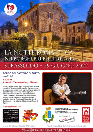 La romantica chitarra classica è la proposta di un recital intimo e virtuosistico a Strassoldo e un tris d’artisti d’eccezione sono i protagonisti dell’immersione nel mondo fantasioso e divertente dell’operetta a Valvasone.
