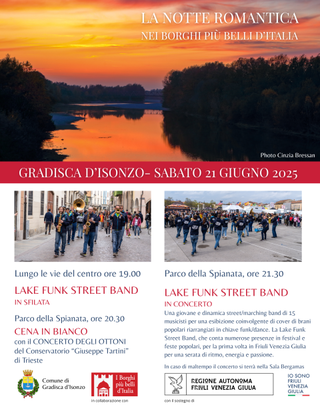 Una giovane e dinamica street/marching band di 15 musicisti per una esibizione coinvolgente di cover di brani popolari riarrangiati in chiave funk/dance. La Lake Funk Street Band, che conta numerose presenze in festival e feste popolari, per la prima volta in Friuli Venezia Giulia per una serata di ritmo, energia e passione.