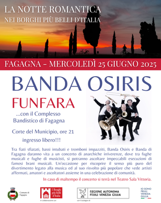 Una grande festa finale chiuderà l’evento Notte Romantica 2025. Tra fiati sfiatati, bassi intubati e tromboni impazziti, Banda Osiris e Banda di Fagagna daranno vita a un concerto di anarchiche irriverenze, dove tra fughe musicali e fughe di musicisti, si potranno ascoltare impeccabili esecuzioni di famosi brani musicali. Un’occasione per riscoprire il senso più puro del divertimento legato alla musica ed al suo risvolto più popolare che vede artisti affermati, amatori e ascoltatori assieme in una celebrazione di comunità.