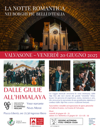 Un viaggio musicale con l'Orchestra Giovanile Filarmonici Friulani attraverso le vette montuose, dalle Alpi fino alle nevi eterne dei grandi “ottomila” himalayani. Un percorso di esperienze, storia, memoria e arte, che attraverso la narrazione di una grandissima alpinista ci conduce dalle Alpi fino a terre e tradizioni lontane.