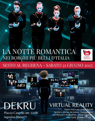 Virtual reality è un’indagine umoristica, suggestiva e dinamica sul rapporto tra corporeo e digitale e sull’influenza che i moderni media hanno sulle nostre vite e sulle nostre relazioni. Si tratta di uno straordinario show internazionale con quattro artisti ucraini (vincitori al Festival Mondiale del Circo di Mosca e al Festival del Clown e Mini di Odessa) fatto di storie e di stories: amore e Instagram, poesia e TikTok e dell’immaginazione e partecipazione diretta del pubblico.