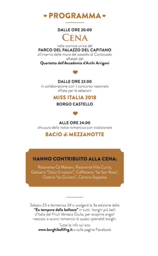 HANNO CONTRIBUITO ALLA CENA: Ristorante Cà Malvani, Ristorante Villa Curtis, Gelateria “Dolci Emozioni”, Caffetteria "Se Son Rose", Osteria “da Giuliano”, Cantine Soppelsa