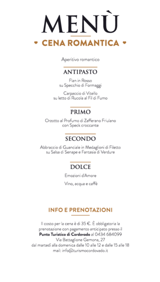 Il costo per la cena è di 35 €. È obbligatoria la prenotazione con pagamento anticipato presso il Punto Turistico di Cordovado al 0434 684099 Via Battaglione Gemona, 27 dal martedì alla domenica dalle 10 alle 12 e dalle 15 alle 18 mail: info@turismocordovado.it