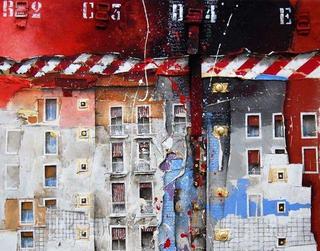 Riconosciamo luoghi che spaziano tra le "vele " di Scampia e il Rozzol Melara di Trieste, proposti nelle tele a tecnica mista con tridimensionalità create a base di stoffe, catrame e malte. Ma la vera chicca sono i disegni: proposti su un materiale fragile e - anche lui- comune come il soggetto: il cartone da imballo, grattato e reso irregolare.
