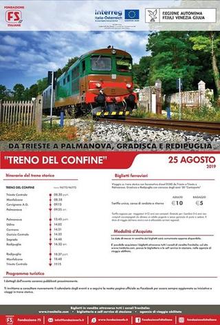Il treno accompagnerà i viaggiatori lungo i confini che hanno diviso, tra il XVI e il XX secolo il territorio dei Friuli Venezia Giulia, visitando alcuni dei luoghi più significativi, centro di contese e guerre per il possesso del territorio, quali la città fortezza veneta di Palmanova, la cittadina di Gradisca d’Isonzo, con un passato tra dominio Veneto ed Imperiale ed infine il sacrario di Redipuglia, luogo simbolico della “Grande Guerra.