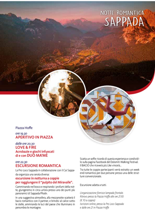 ore 22.30 Escursione Romantica adatta a tutti per raggiungere il "pulpito del Miravalle". L'organizzazione fornisce lampada frontale. Ritrovo presso la piazza Hoffe alle 21.30. Costo di 10 euro a coppia.