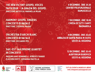 La rassegna prende il via sabato 6 dicembre al Polifunzionale di Ramuscello, dove alle 20.30 si esibiscono The New Victory Gospel Voices, guidati con la consueta bravura da Marinella Milan; si tratta di un evento organizzato assieme alla Pro Ramuscello.