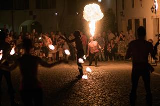 d’arte medievale (duelli di spada, mangiatori di fuoco, musici, tamburi e bandiere, numeri di acrobazie e comicità medievale).