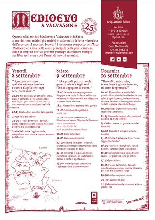 Il tema. Quest’anno il tema sarà dedicato a uno dei miti più antichi e universali: l’eroe leggendario Beowulf che lotta e sconfigge dei mostri epici. Beowulf prende il nome dal poema composto nell’Alto Medioevo che è una delle opere principali della poesia inglese, dove si narrano le imprese che il giovane principe scandinavo compie per liberare la terra dei Danesi da mostri assassini. Le gesta dell’eroe saranno raccontate nelle tre giornate della rievocazione, nel Teatro dei Misteri: sarà una grande rappresentazione teatrale itinerante per le vie e le piazze del borgo che consentirà al pubblico di sentir narrare delle antiche gesta dell’eroe leggendario dei Geati: il grande Beowulf.
