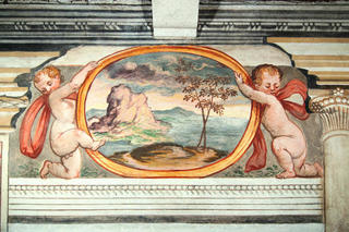 A fianco sono poste due coppie di puttini. A sinistra uno dei due solleva una zucca, mentre l'altro suona uno strumento rinascimentale. A destra entrambi gli amorini stanno suonando, e ai loro piedi si trova uno scoiattolo, animale emblema di prudenza e avvedutezza.