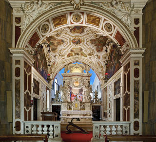 V središču prezbiterija od leta 1688 kraljuje glavni oltar iz belega marmorja iz Carrara, z angeli in prizorom prikazovanja, delo Giovanni Grassi s sodelovanjem Giovanni Comin. Ikona Madonna col bambino je pripisana Bellunello ali bellunellianskemu krogu (1480?); leta 1992 je bila vstavljena slika Nozze di Cana di Glauco Benito Tiozzo. Odseki oboka so delo Filippo Zaniberti (Devica doji bolnika, Prikazovanje Device menihu, slikarju ikon, Čudežna ustanovitev bazilike S.Maria maggiore, Čudežni poseg Device med bitko).